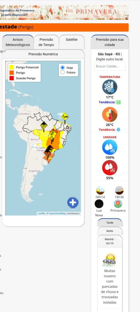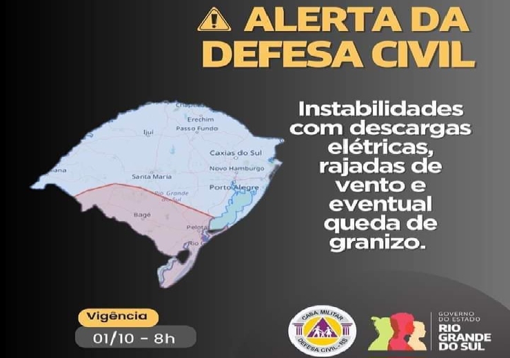 ⚠️ A Defesa Civil emitiu um alerta de instabilidades para o dia 1º de outubro de 2024, com riscos de descargas elétricas, rajadas de vento e eventual queda de granizo em São Sepé e regiões próximas.