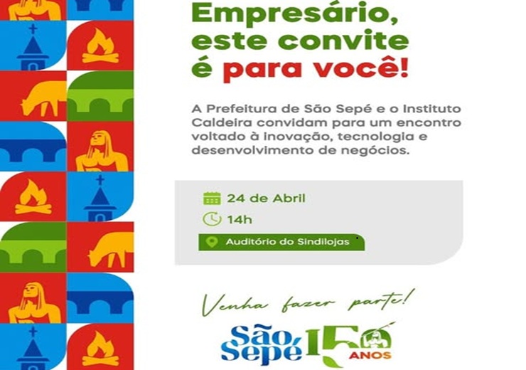 A Prefeitura de São Sepé, em parceria com o Instituto Caldeira, promove no próximo dia 24 de abril um encontro voltado ao fortalecimento do ambiente de negócios no município e na região. A iniciativa reúne empresários e lideranças para um momento de troca de experiências, debate e apresentação de tendências nas áreas de inovação, tecnologia e desenvolvimento empresarial.