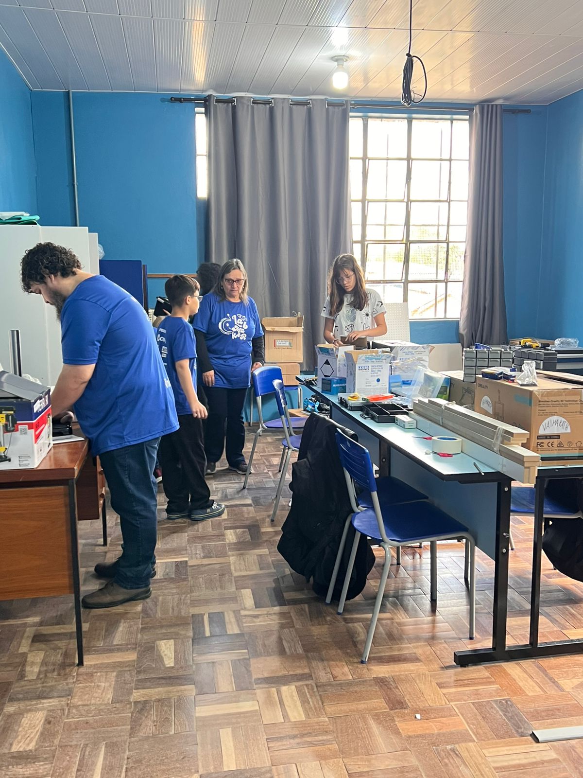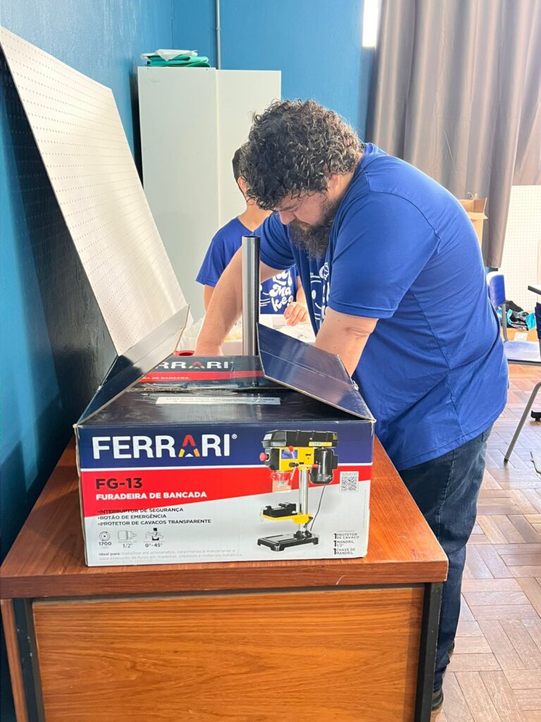 Entre os materiais entregues estão impressora 3D, impressora a laser, furadeira de bancada, kits de robótica, notebook, tablets e ferramentas para trabalhos em madeira e outras estruturas.