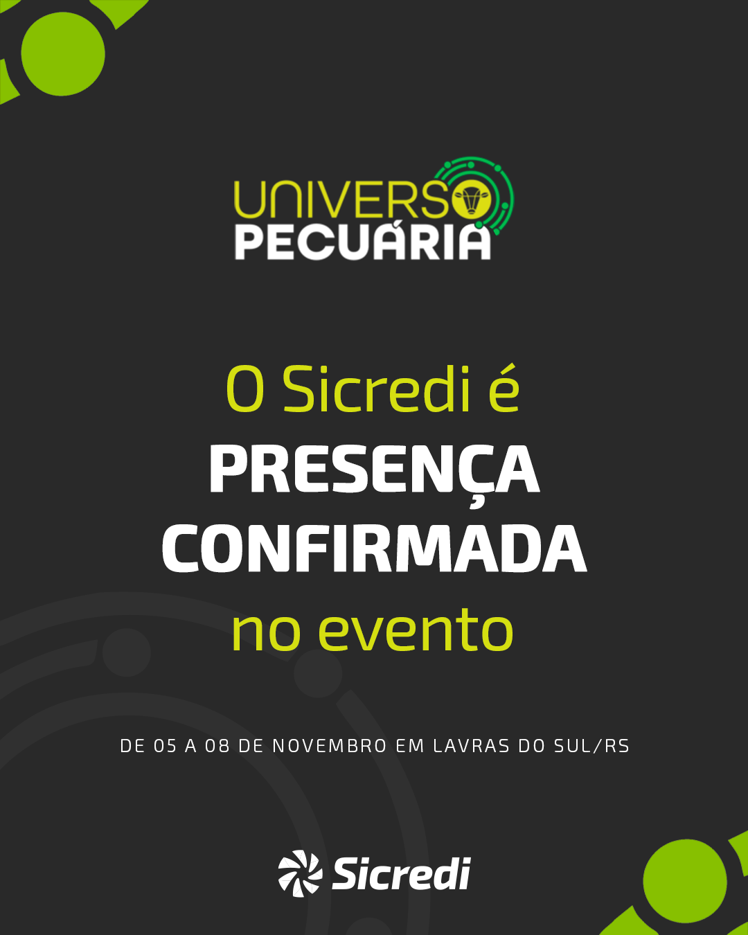 O Sicredi estará presente no Universo Pecuária 2025, um dos principais eventos do setor agropecuário, que acontece nos dias 05, 06, 07 e 08 de novembro, em Lavras do Sul/RS.