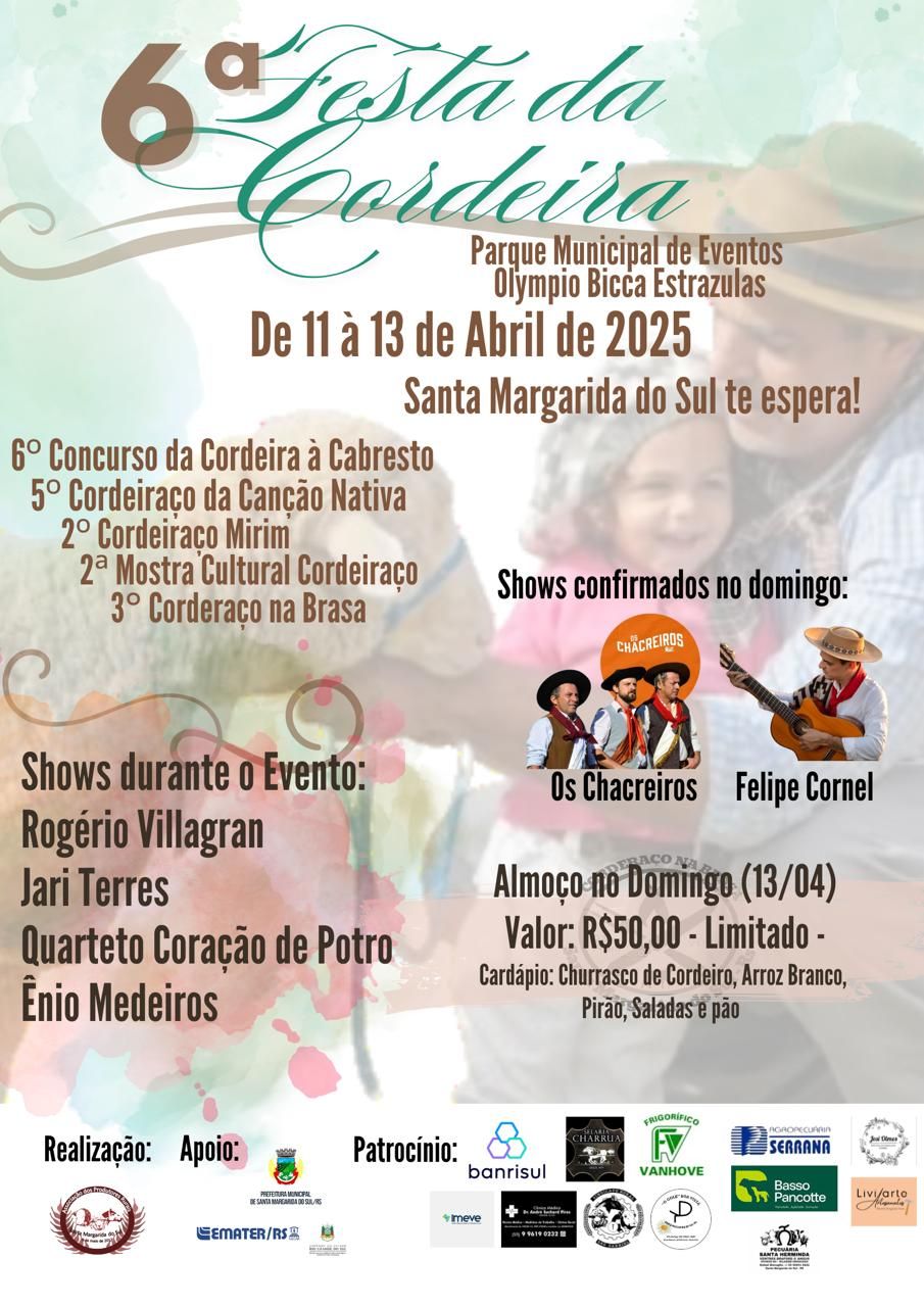 Cordeiraço da Canção Nativa e 2° Cordeiraço Mirim, 11 / 12 e 13 de Abril de 2025 em Santa Margarida do Sul 2 de abril de 2025 Cultura, Geral, Região Cordeiraço da Canção Nativa e 2° Cordeiraço Mirim acontece em 11 / 12 e 13 de Abril de 2025, no Parque Municipal de Eventos Olympio Bicca Estrazulas em Santa margarida do Sul.